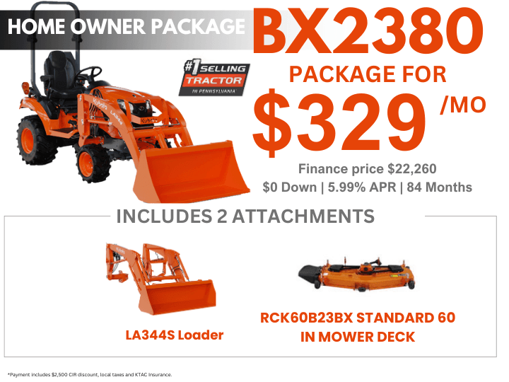 *Customer instant rebates of $4,000 are available on qualifying finance or cash purchases or BX2380 equipment. **0% Down, 5.99% A.P.R. financing for up to 84 months on purchases of select new Kubota BX2380 equipment from participating dealers’ in stock inventory is available to qualified purchasers through Kubota Credit Corporation, U.S.A.; subject to credit approval. Example: 84 monthly payments of $14.60 per $1,000 financed. Some exceptions apply. Offers expires 12/31/2025. Terms subject to change. This material is for descriptive purposes only. Kubota disclaims all representations and warranties, express or implied, or any liability from the use of this material. For complete warranty, disclaimer, safety, incentive offer and product information, see Dealer or go to KubotaUSA.com. †Power (HP/KW) and other specifications are based on various standards or recommended practices.